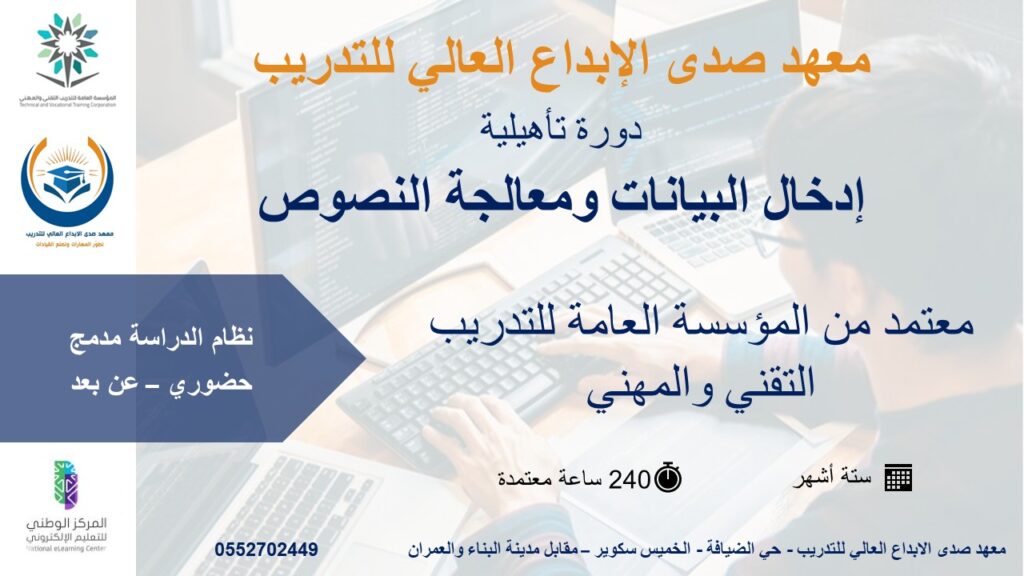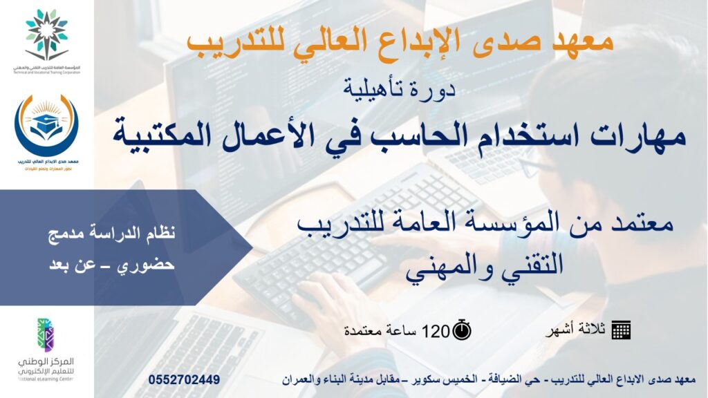دورات الحـــــــاسب الالــي استثمر في نفسك اليوم… وبدأ رحلتك نحو التميز… فخطوة علم واحدة قد تغيّر حياتك مهارات استخدام الحاسب في الأعمال المكتبيةمدة الدورة 3 اشهر – 120 ساعةمعتمدة من المؤسسة العامة للتدريب التقني والمهني سجل الان إدخال البيانات ومعالجة النصوصمدة الدورة 6 اشهر – 240 ساعةمعتمدة من المؤسسة العامة للتدريب التقني والمهني سجل الان دورات اخرى قد تهمك