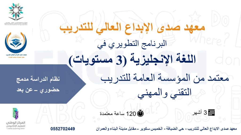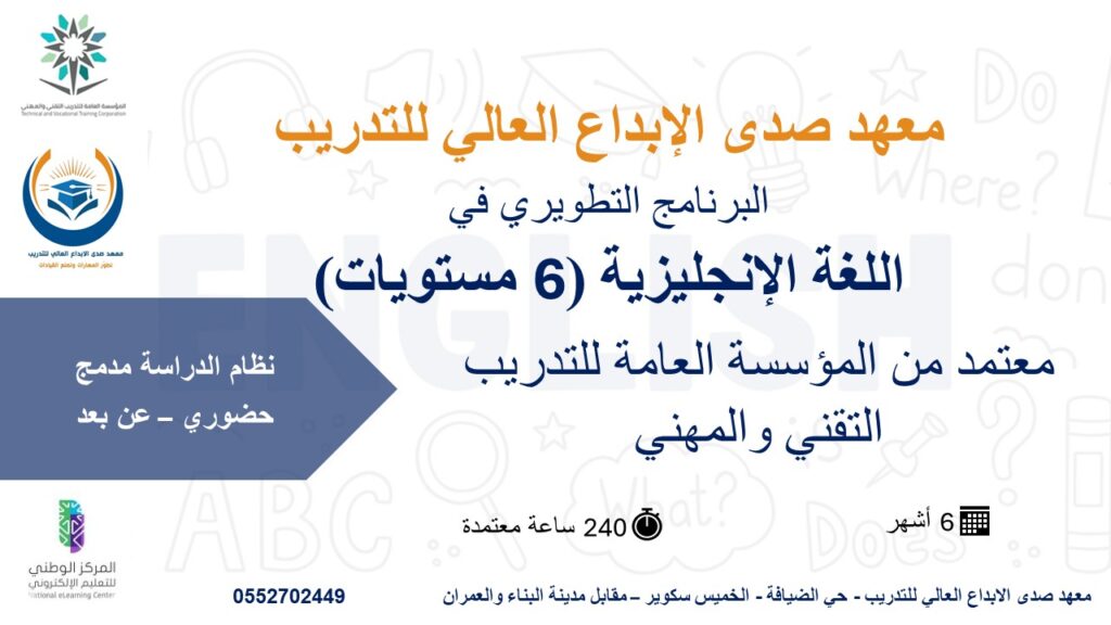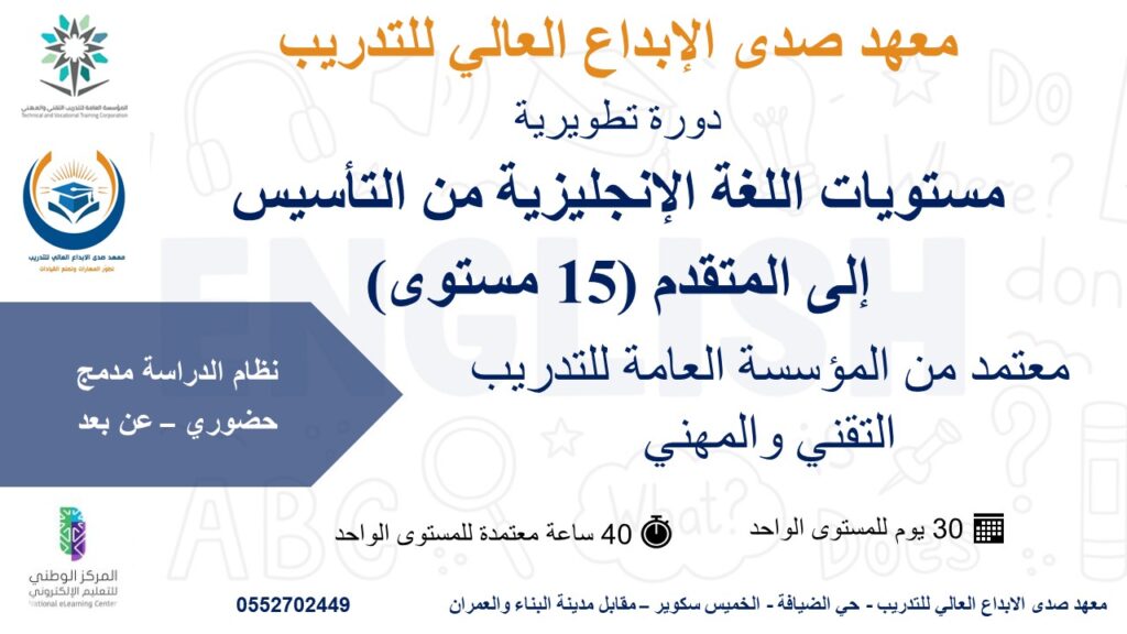 دورات اللغــــة الانجليزية استثمر في نفسك اليوم… وبدأ رحلتك نحو التميز… فخطوة علم واحدة قد تغيّر حياتك مستويات اللغة الإنجليزية من التأسيس إلى المتقدم (15 مستوى)مدة الدورة 30 يوم للمستوى الواحد-40 ساعة معتمدة للمستوى الواحدمعتمدة من المؤسسة العامة للتدريب التقني والمهني سجل الان البرنامج التطويري في اللغة الانجليزية (3 مستويات)مدة الدورة 3 اشهر – 120 ساعةمعتمدة من المؤسسة العامة للتدريب التقني والمهني سجل الان البرنامج التطويري في اللغة الانجليزية (6 مستويات)مدة الدورة 6 اشهر – 240 ساعةمعتمدة من المؤسسة العامة للتدريب التقني والمهني سجل الان دورات اخرى قد تهمك